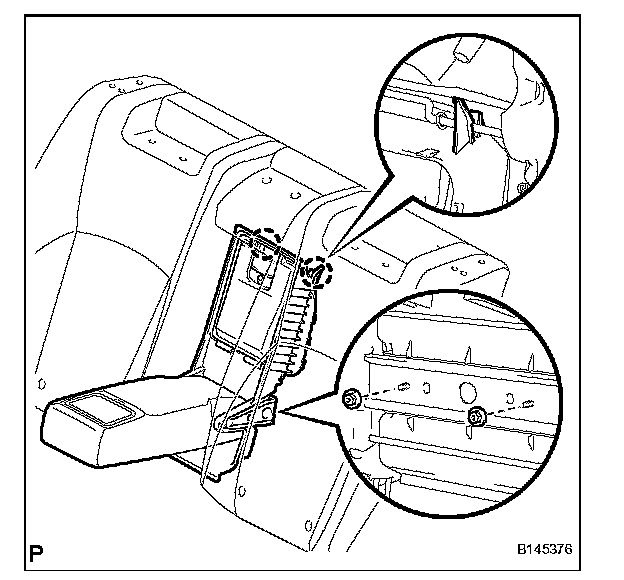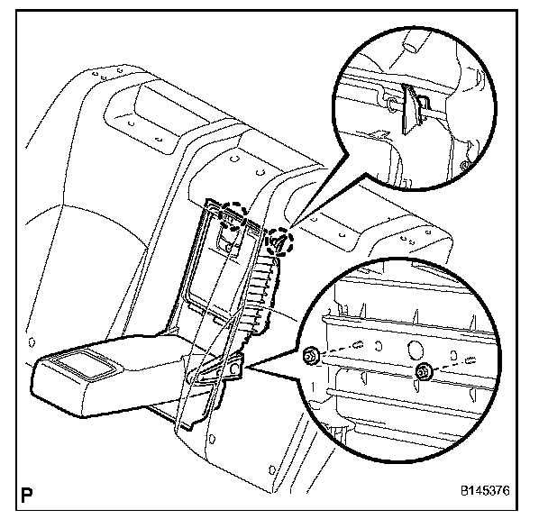b. Disengage the 2 claws and remove the rear center seat armrest assembly.