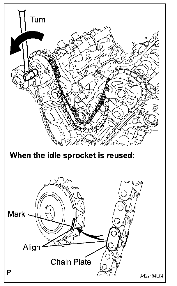 NOTICE: When the idle sprocket is reused, align the chain plate with the mark where the plate had been in order to tighten the chain between the banks.