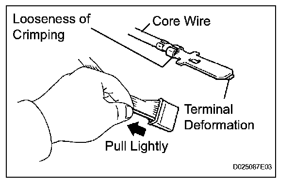 Check by pulling the wire harness lightly from the backside of the connector. Look for unlatched terminals, missing terminals, loose crimps or broken conductor wires. Check visually for corrosion, metallic or foreign matter and water, and bent, rusted, overheated, contaminated, or deformed terminals.