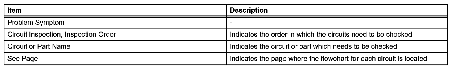 When a "Normal" code is output during a DTC check but the problem still occurs, use the Problem Symptoms Table. The suspected areas (circuits or parts) for each problem symptoms are in the table. The suspected areas are listed in order of probability. A description of each of the chart's columns is shown in the table.
