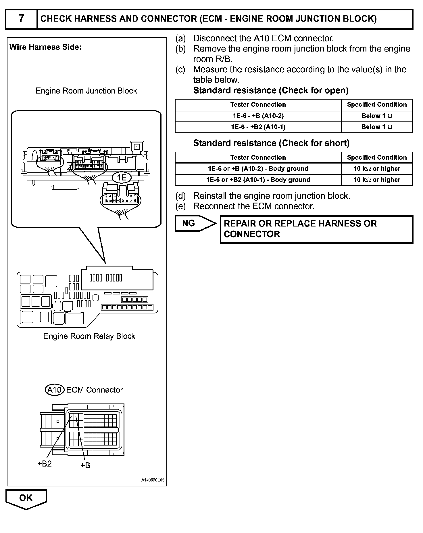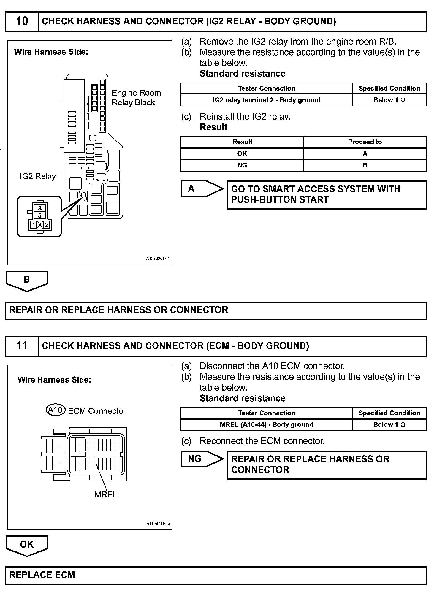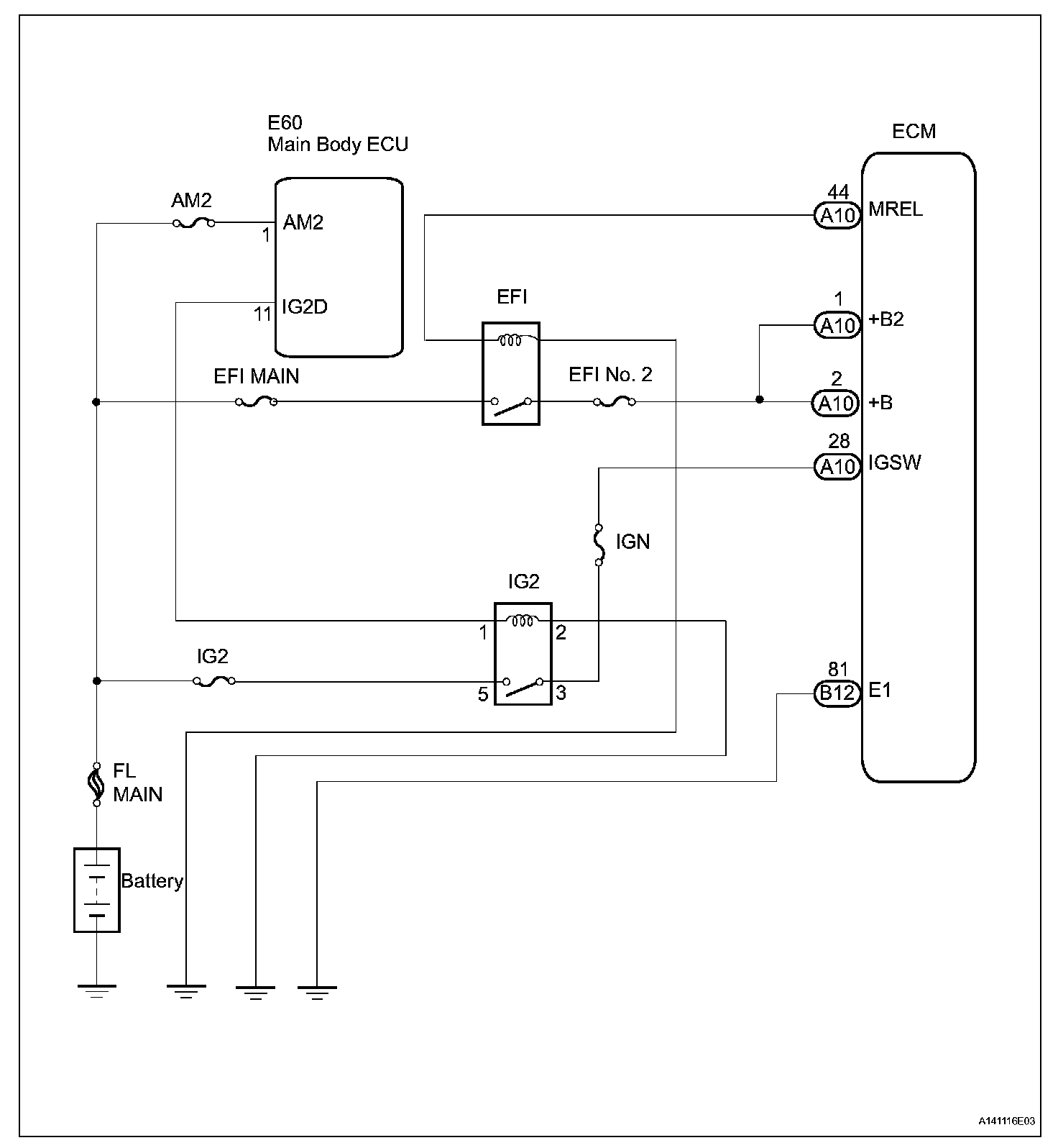 When the engine switch is turned on (IG), voltage from the ECM's MREL terminal applies to the engine room junction block (EFI relay). This causes the contacts of the engine room junction block (EFI relay) to close, which supplies power to terminal +B or +B1 of the ECM.