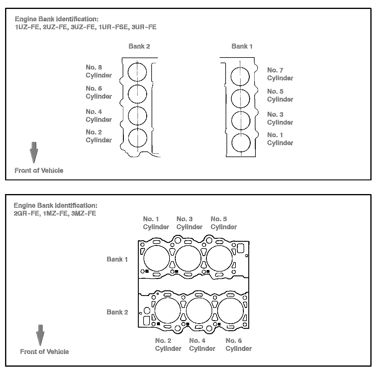 This bulletin contains information that identifies engine bank 1 and engine bank 2 on the following engines: 2GR-FE, 2GR-FSE, 4GR-FSE, 2JZ-GE, 1MZ-FE, 3MZ-FE, 1UR-FSE, 3UR-FE, 1UZ-FE, 2UZ-FE, and 3UZ-FE.