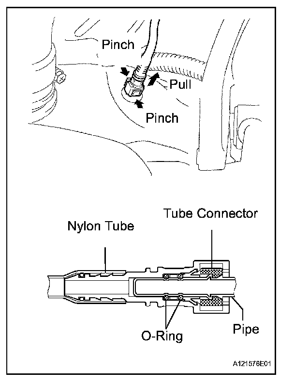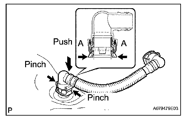 1. Pinch the tube connector and then pull out the No. 1 fuel tube.