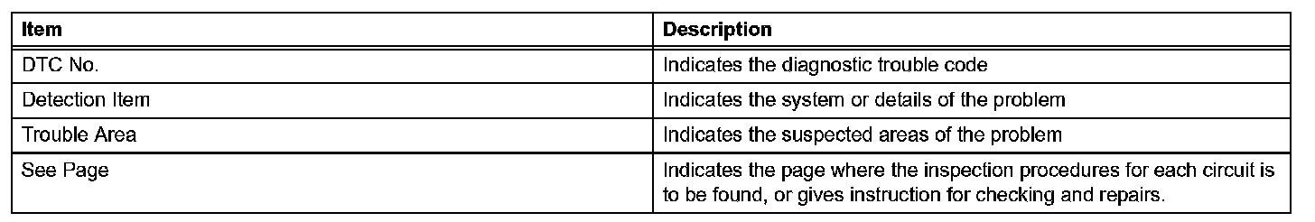 Look for output Diagnostic Trouble Codes (DTCs) (from the DTC checks) in the appropriate section's Diagnostic Trouble Code Chart. Use the chart to determine the trouble area and the proper inspection procedure. A description of each of the chart's columns is shown in the table.