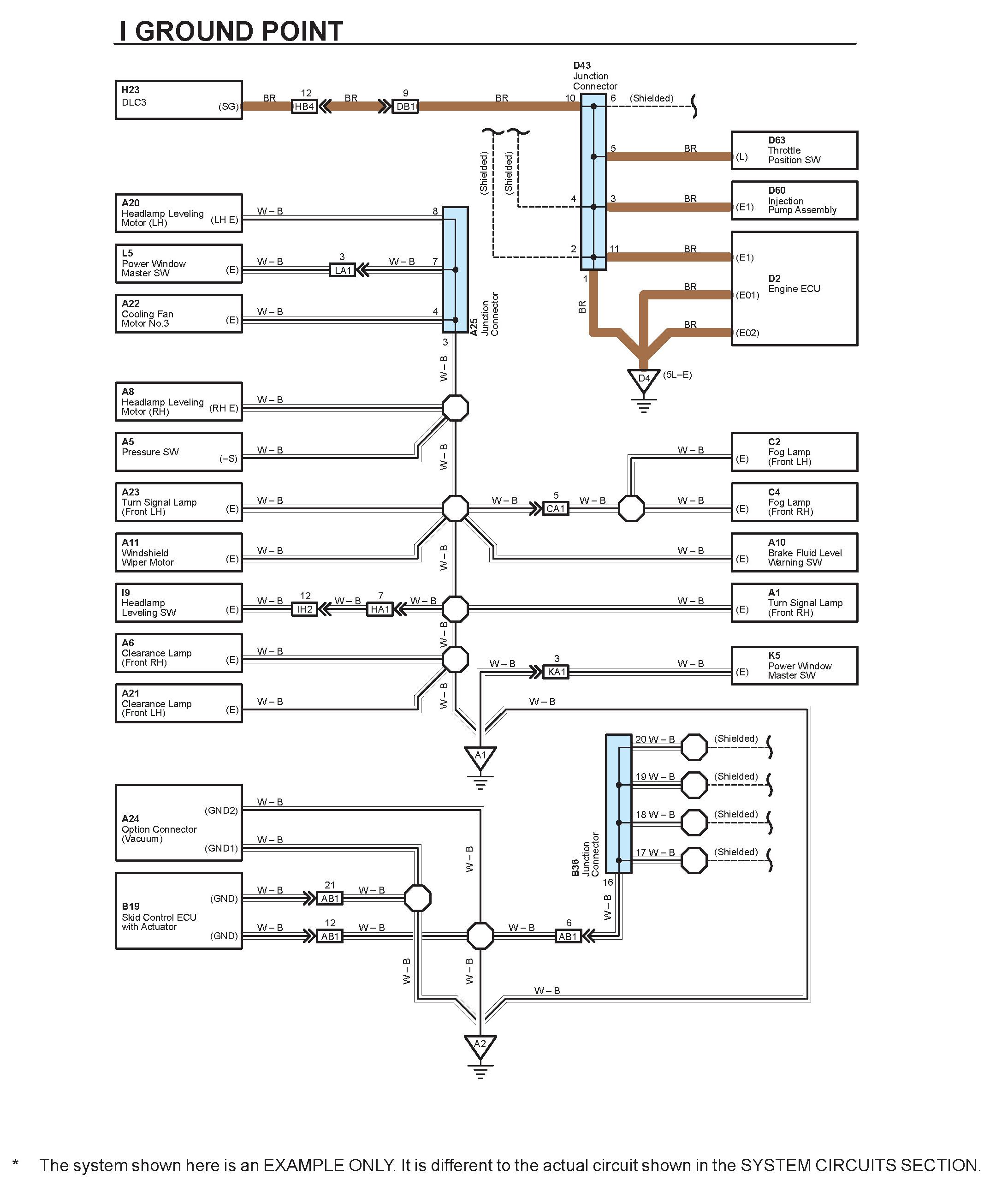 HOW TO READ GROUND POINTSThe ground points circuit diagram shows the connections from all major parts to the respective ground points. When troubleshooting a faulty ground point, checking the system circuits which use a common ground may help you identify the problem ground quickly. The relationship between ground points (A1, A2 and D4) can also be checked this way.