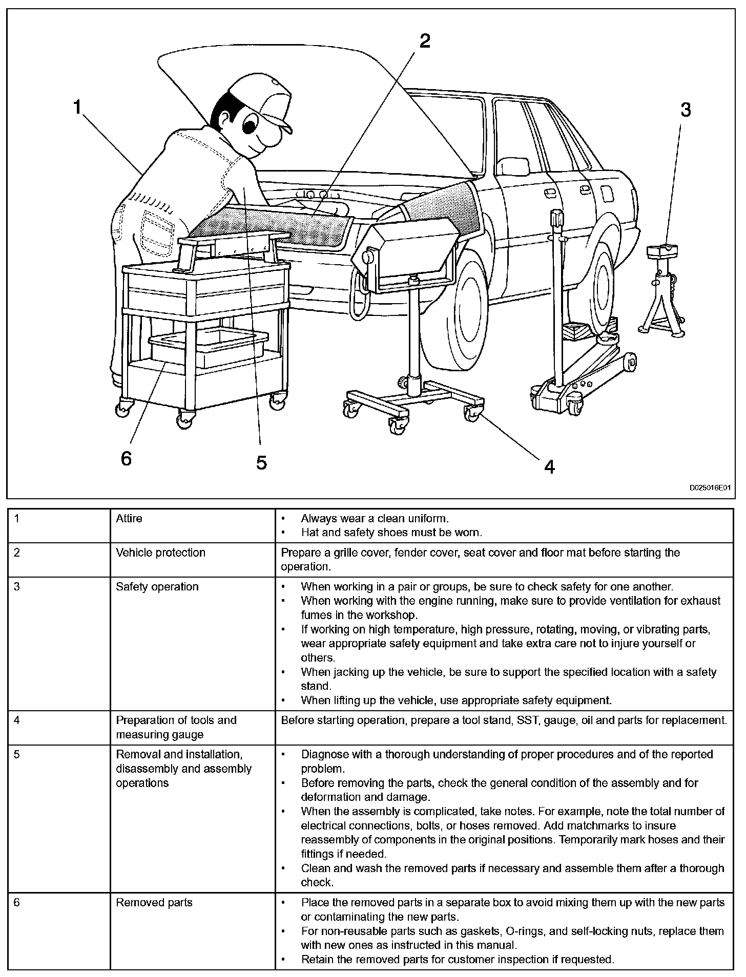 1. Care must be taken when jacking up and supporting the vehicle. Be sure to lift and support the vehicle at the proper locations.
