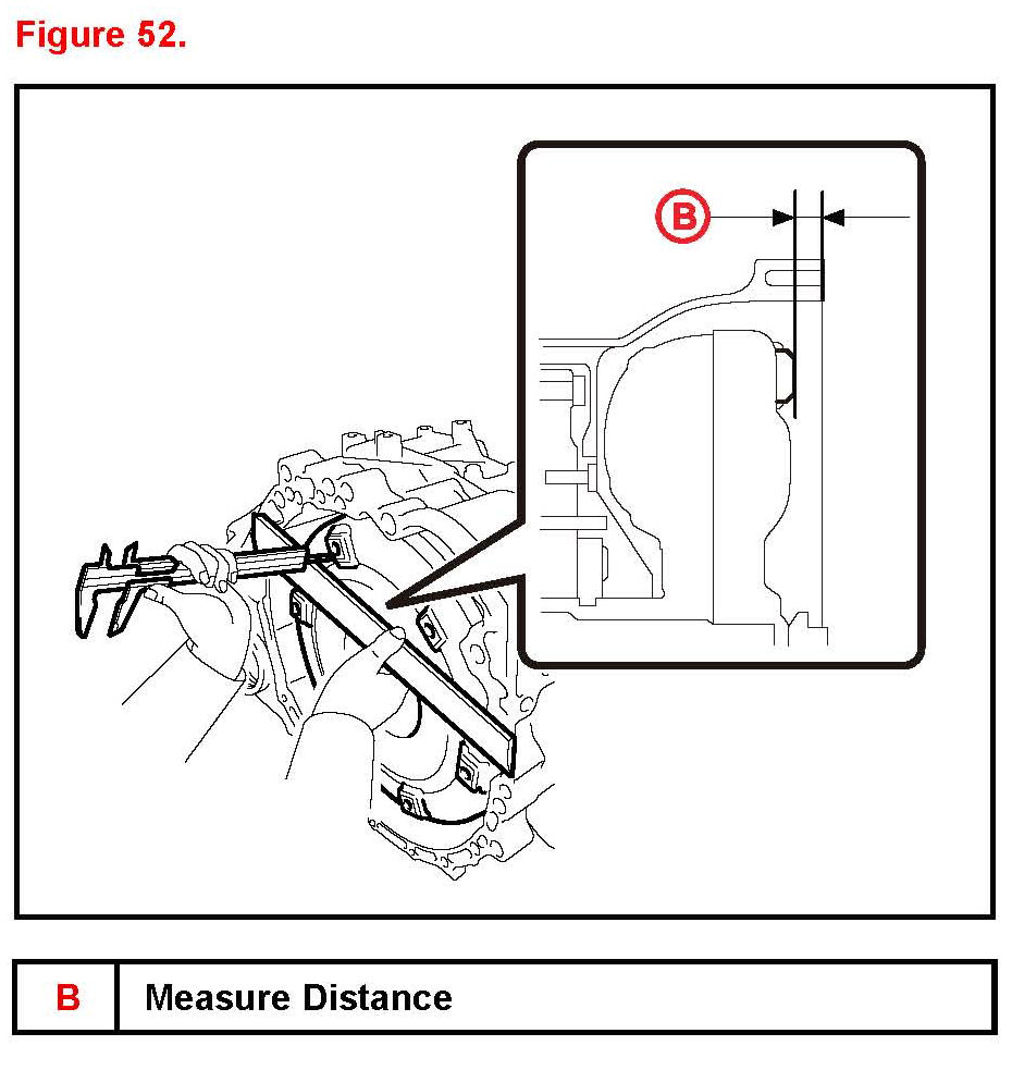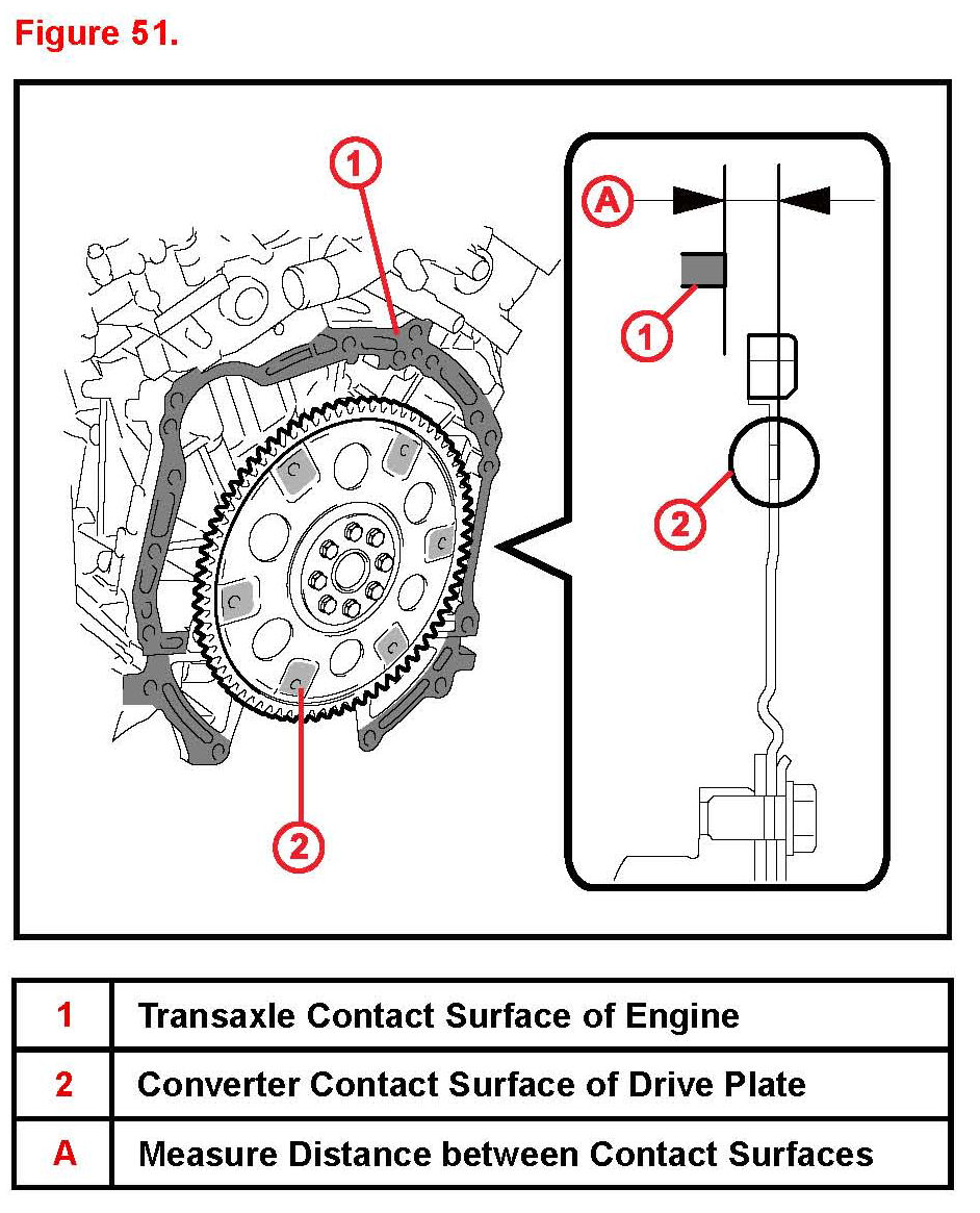 D. Using a vernier caliper and a straightedge measure dimension "A" between the transaxle contact surfaces of the engine and the converter contact surfaces of the drive plate.
