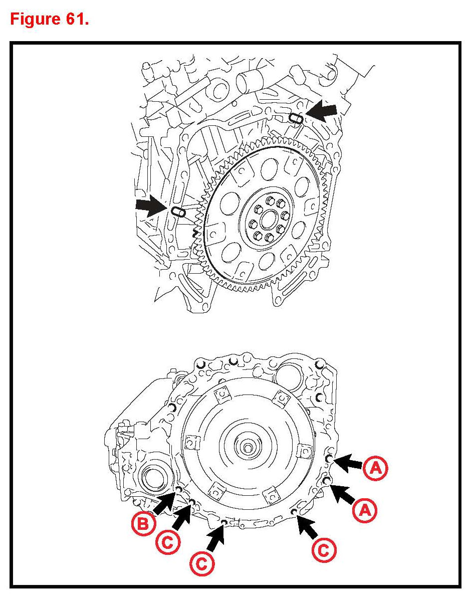 B. Keeping the engine and automatic transaxle assembly in a horizontal position align the knock pins with each hole on the automatic transaxle assembly and tighten the 6 bolts shown in the illustration.