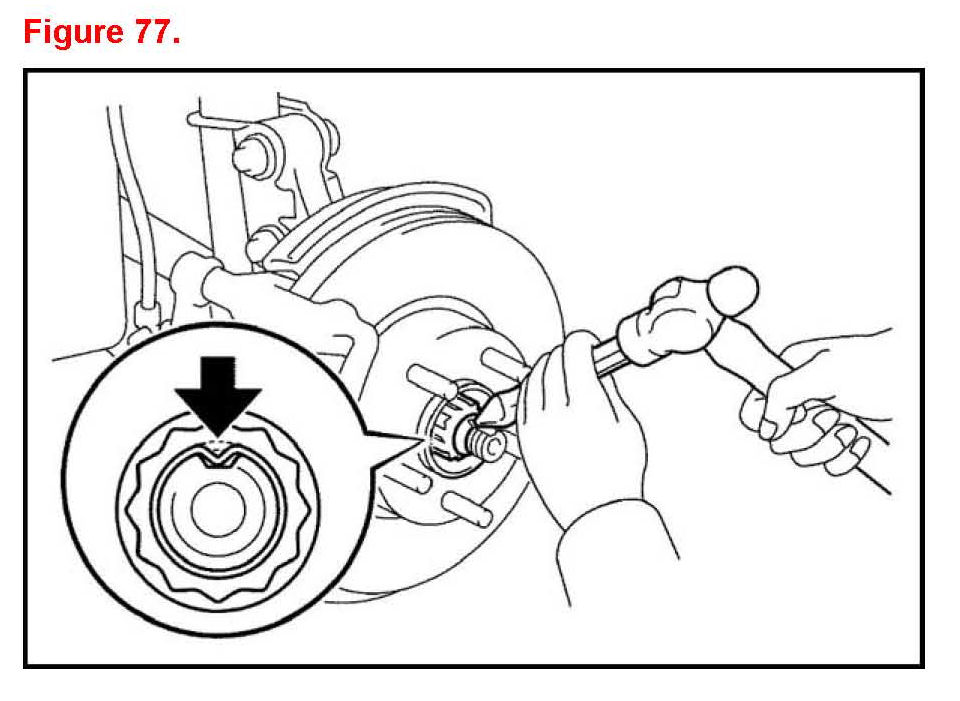 C. Using a chisel and hammer stake the front axle hub nut.