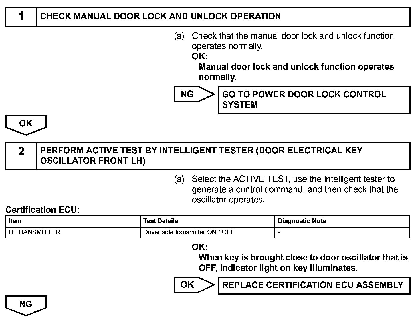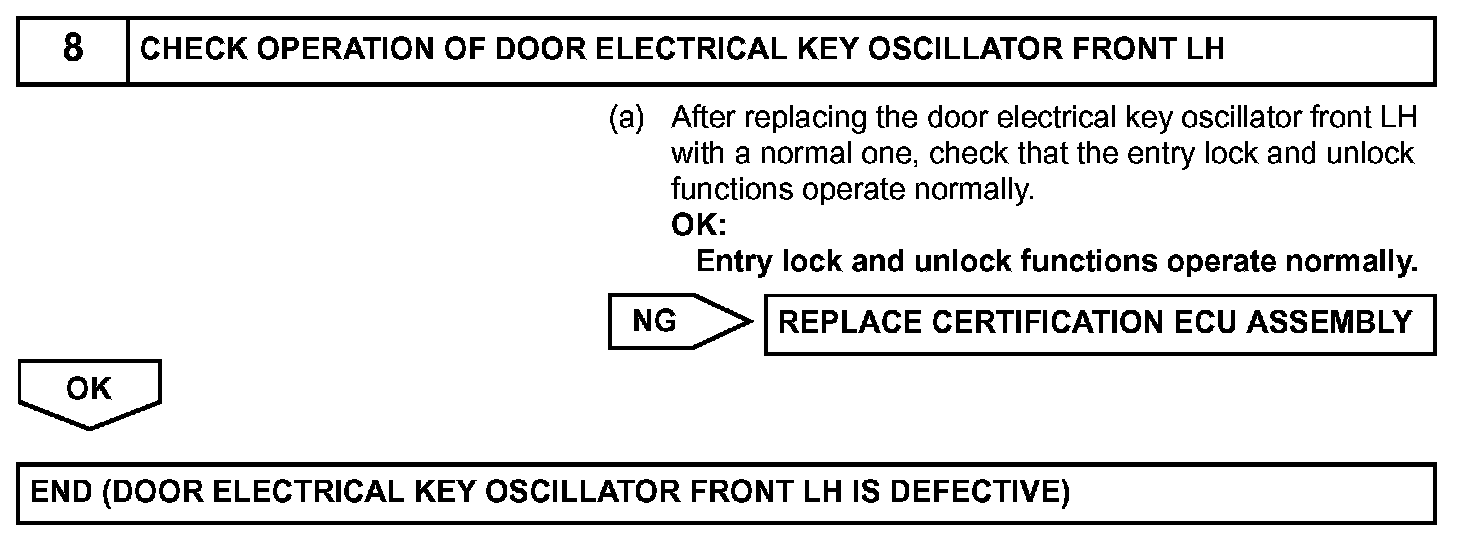 Both the entry lock and unlock functions do not operate when: 1) nothing is output from the door electrical key oscillator front LH, 2) the smart access system with push-button start is disabled through customization, or 3) the entire power door lock control system is malfunctioning.