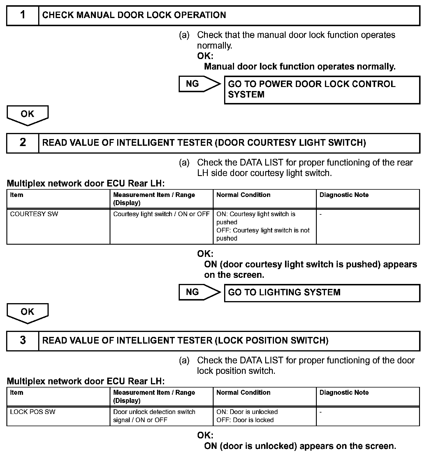 When the touch sensor inside the outside door handle rear LH is touched, the multiplex network door ECU rear LH (rear door LH ECU) sends a request signal to the door electrical key oscillator rear LH. The key receives this request and transmits its ID code. Upon receiving the ID code, the certification ECU determines that the key is outside the vehicle and sends a lock signal to the rear door LH lock through the cowl side junction block RH (multiplex network body ECU).