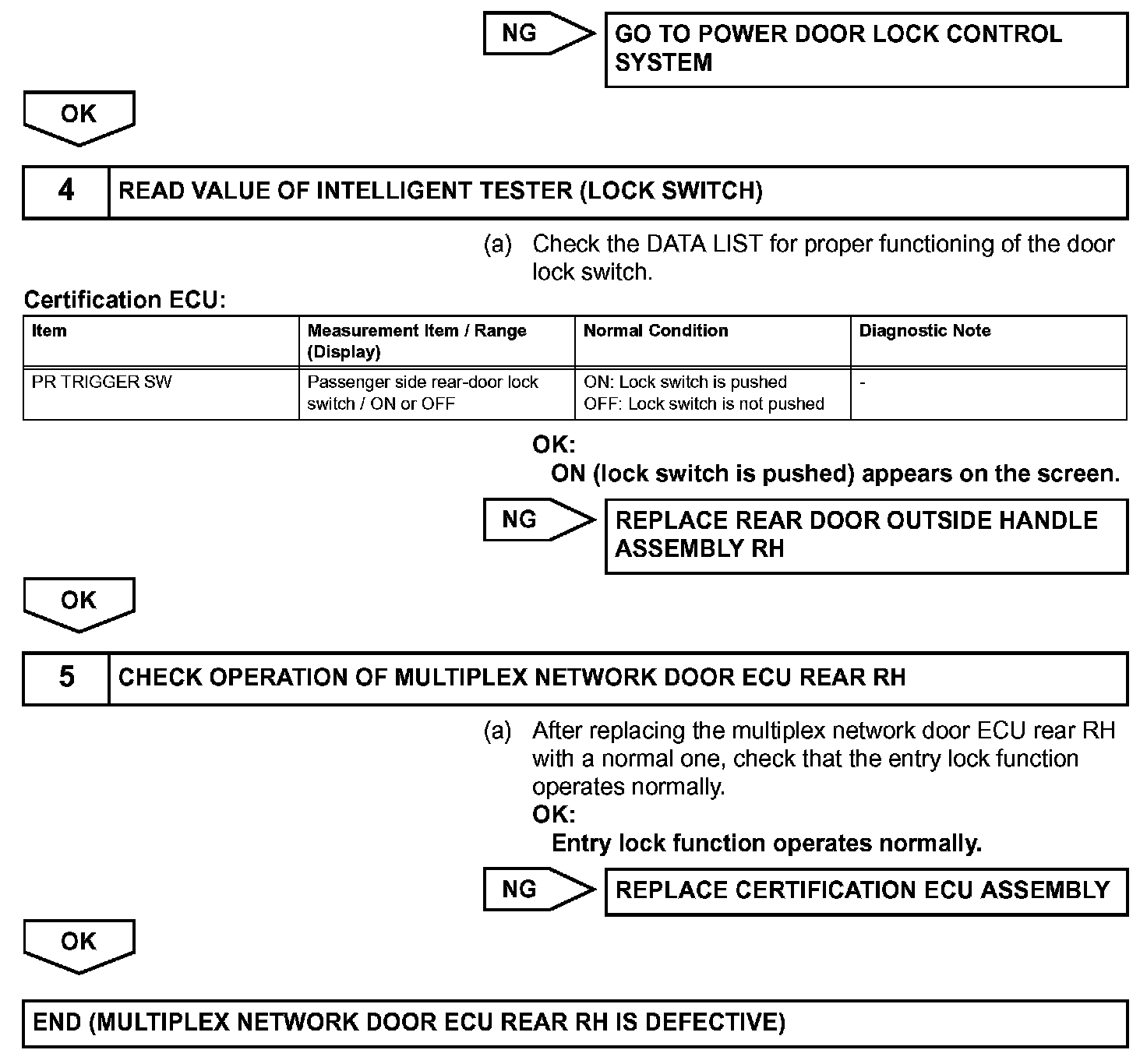 When the touch sensor inside the outside door handle rear RH is touched, the multiplex network door ECU rear RH (rear door RH ECU) sends a request signal to the door electrical key oscillator rear RH. The key receives this request and transmits its ID code. Upon receiving the ID code, the certification ECU determines that the key is outside the vehicle and sends a lock signal to the rear door RH lock through the cowl side junction block RH (multiplex network body ECU).