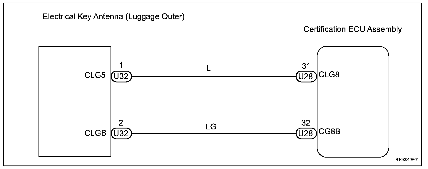 When the power luggage door open switch is turned ON, the certification ECU uses the luggage electrical key antenna (outer) and antenna to output a request signal to the outside of the vehicle for a distance of approximately 1.0 m (3.3 ft) from the luggage compartment door. A key near the luggage compartment door detects this request and transmits its ID code. The entry door control receiver receives the ID code and sends this ID code to the certification ECU. The certification ECU checks if the ID code is valid. When the ID code is valid, the certification ECU sends a luggage compartment door open signal to the cowl side junction block LH (drive side junction block ECU) using the multiplex communication line and stops outputting request signals. The luggage room junction block then unlocks the luggage compartment door.