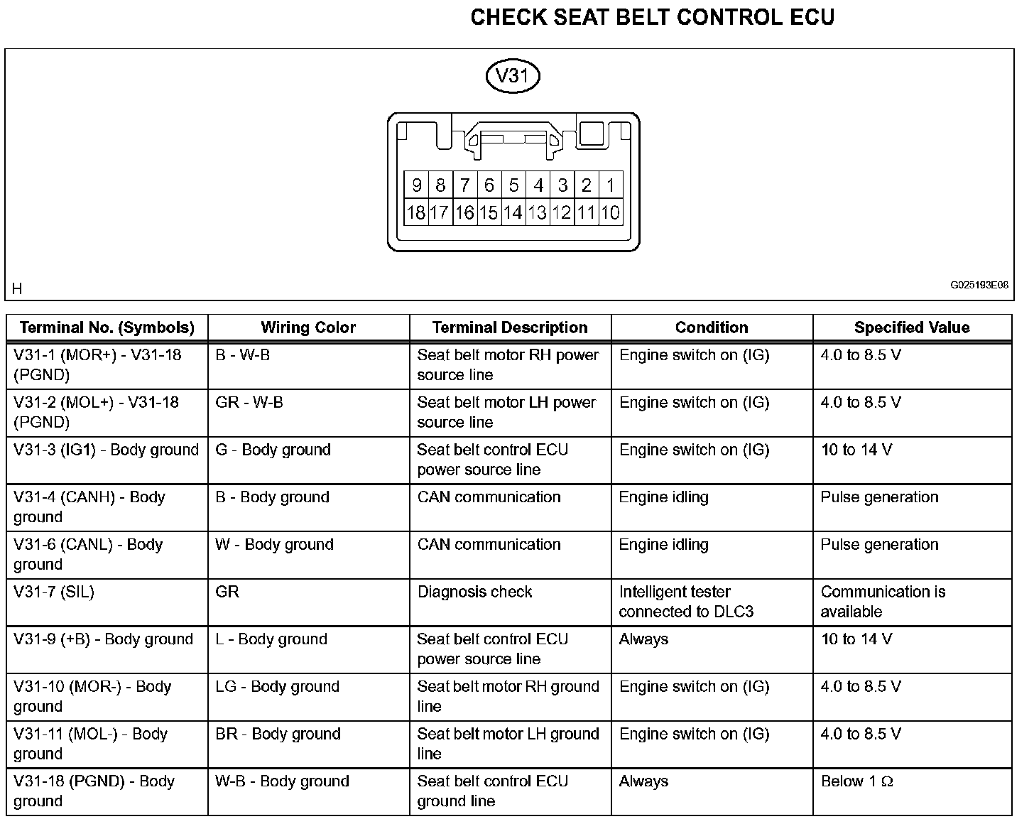 Terminals Of Control Module/Pinouts - Check Seat Belt Control ECU: