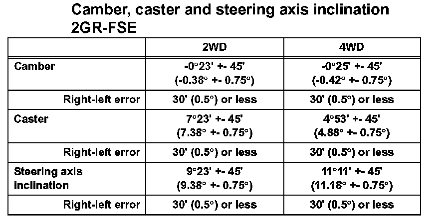 ^ The maximum tolerance of right and left difference for the camber and caster is 30' (0.5°) or less.