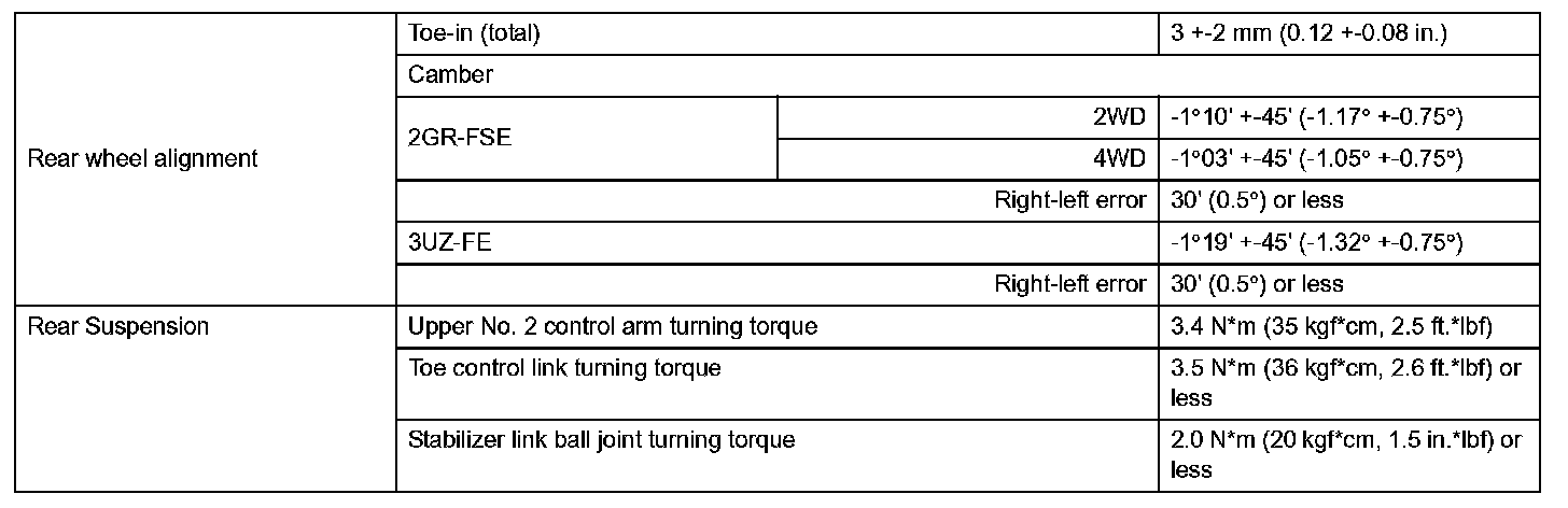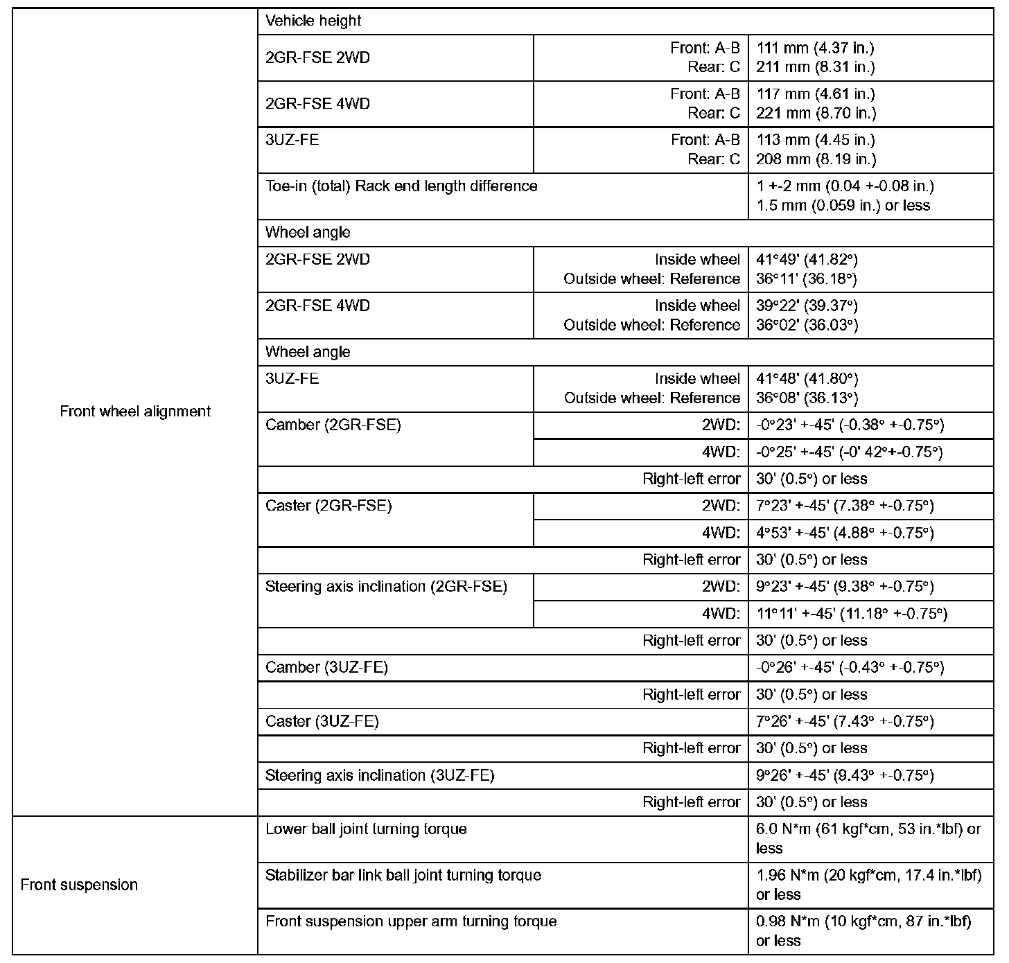 Front Suspension Service Data: