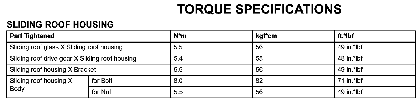 Sliding Roof - Torque Specifications: