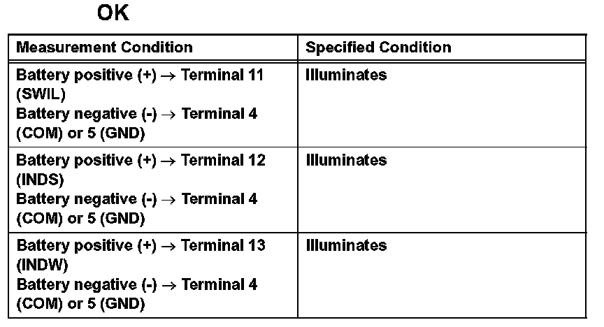 b. Apply battery voltage between the terminals of the switch, and check the illumination condition of the switch.