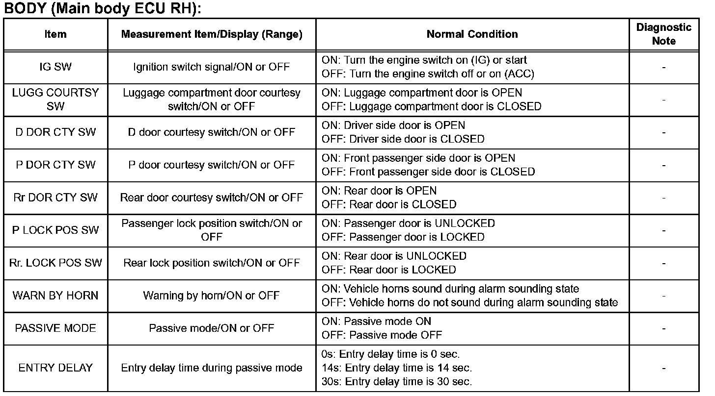 DATA LISTHINT: Using the intelligent tester DATA LIST allows switch, sensor, actuator and other item values to be read without removing any parts. Reading the DATA LIST early in troubleshooting is one way to shorten labor time.