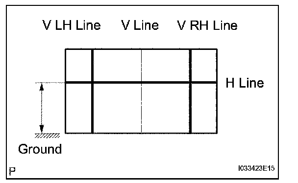 Draw a horizontal line across the screen so that it passes through the center marks. The H line should be at the same height as the headlight bulb center marks of the low-beam headlights.