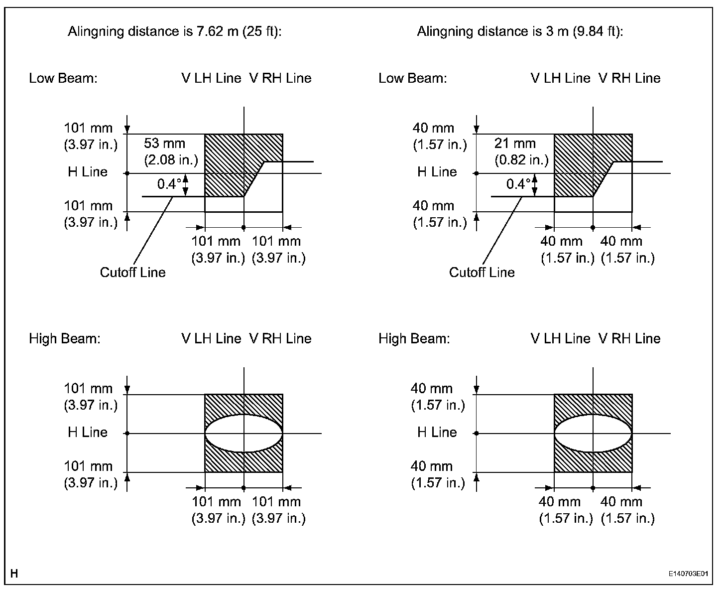 The cutoff line is 101 mm (3.97 in.) above and below the H line as well as left and right of the V line with high-beam (SAE J599).