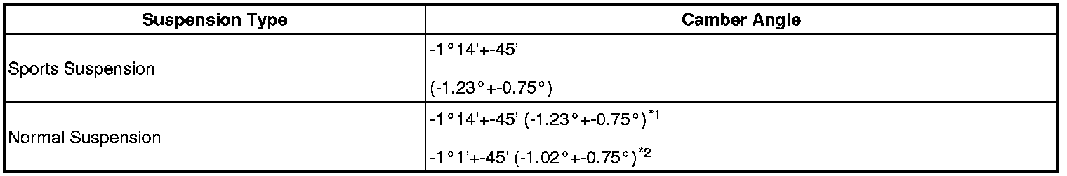 If the measured value is not within the specified range, inspect the suspension parts for damage and wear. Replace parts as necessary because camber cannot be properly adjusted with any damaged or worn parts.