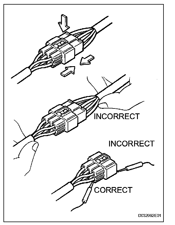 2. Checking when a connector is disconnected: Check by pulling the wire harness lightly from the backside of the connector. Look for unlatched terminals, missing terminals, loose crimps or broken conductor wires. Check visually for corrosion, metallic or foreign matter and water, and bent, rusted, overheated, contaminated, or deformed terminals.