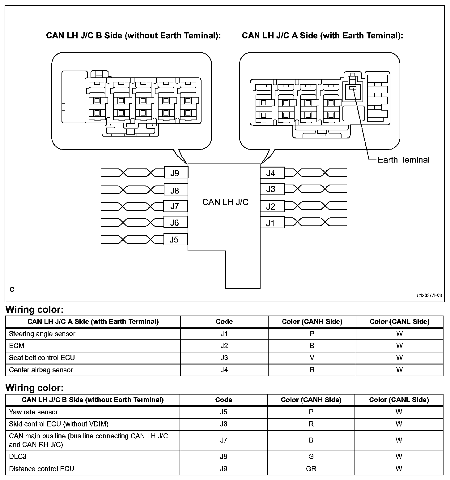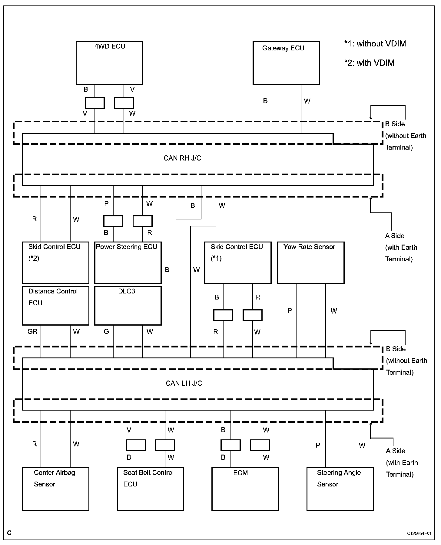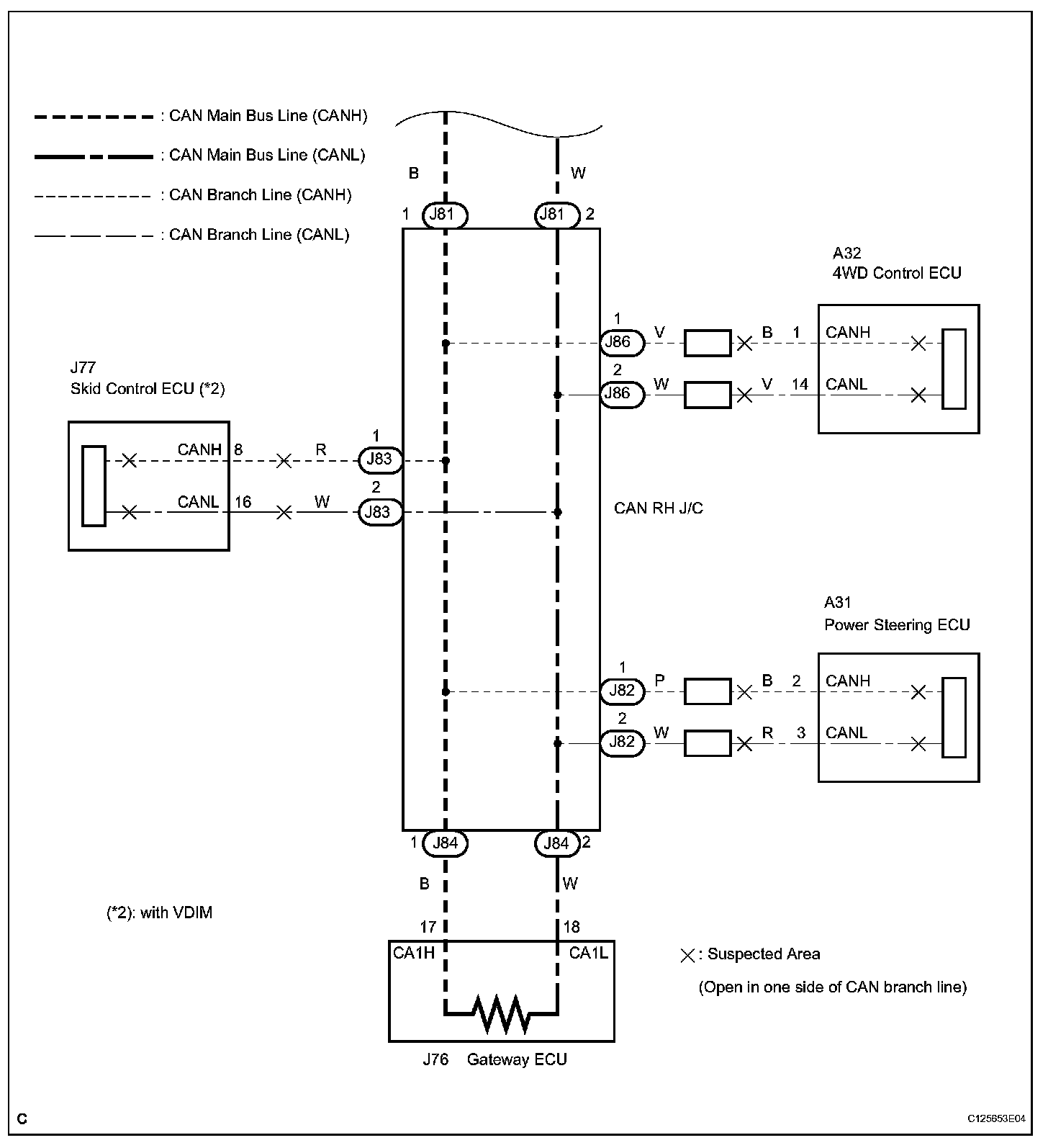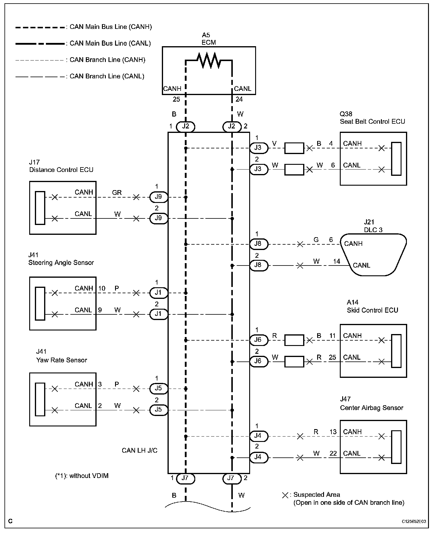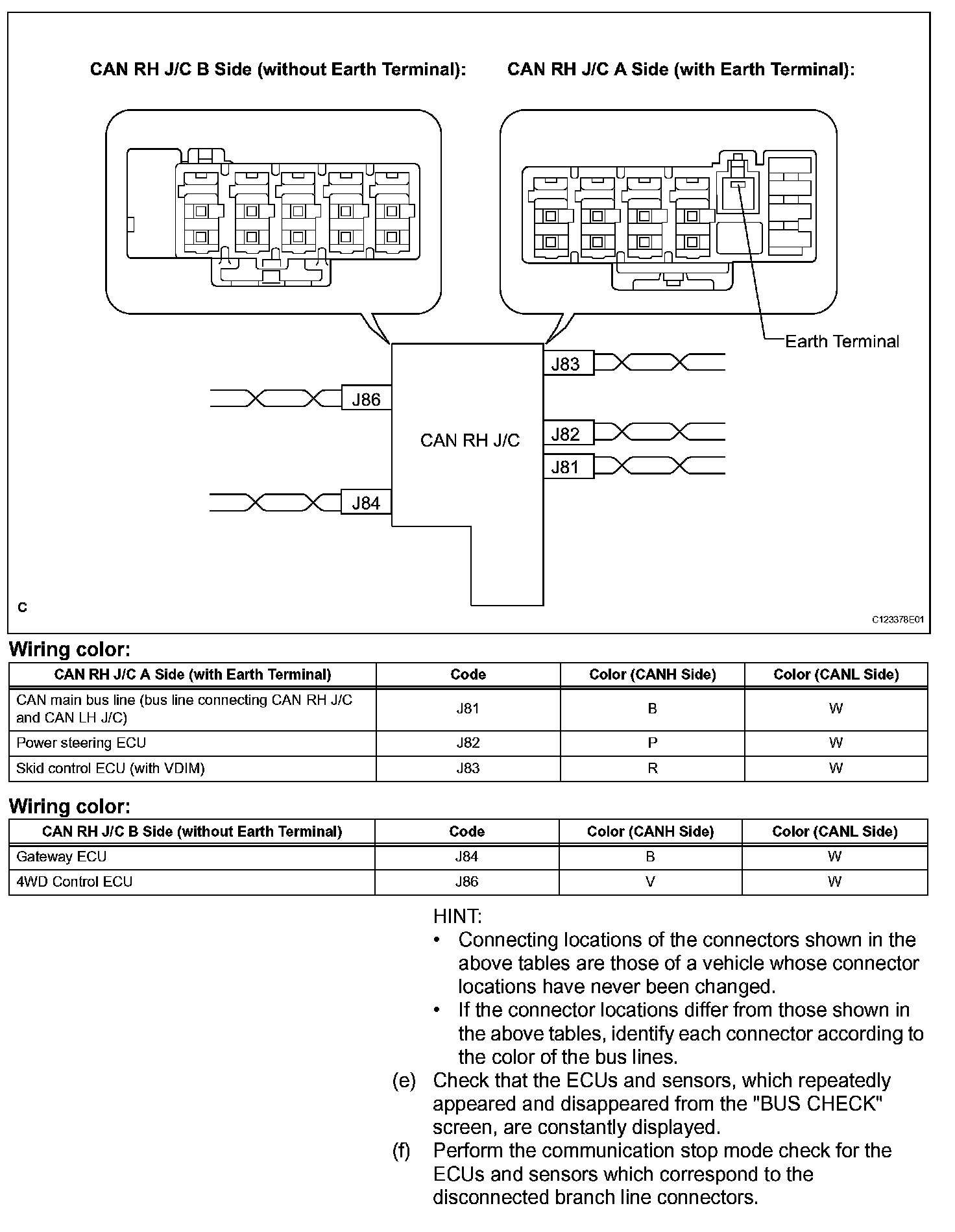 If some ECUs and sensors are not displayed on the "BUS CHECK" screen of the intelligent tester and some ECUs and sensors repeatedly appear and disappear from the screen when the CAN main bus lines are normal (there is no open, short, short to B+, or short to GND in the main bus lines), there may be an open circuit in either of the CAN branch lines.