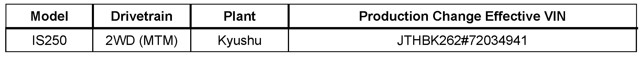 - 2006 - 2007 model year IS 250 vehicles equipped with the 4GR-FSE engine and manual transmission, and produced BEFORE the Production Change Effective VINs shown below.