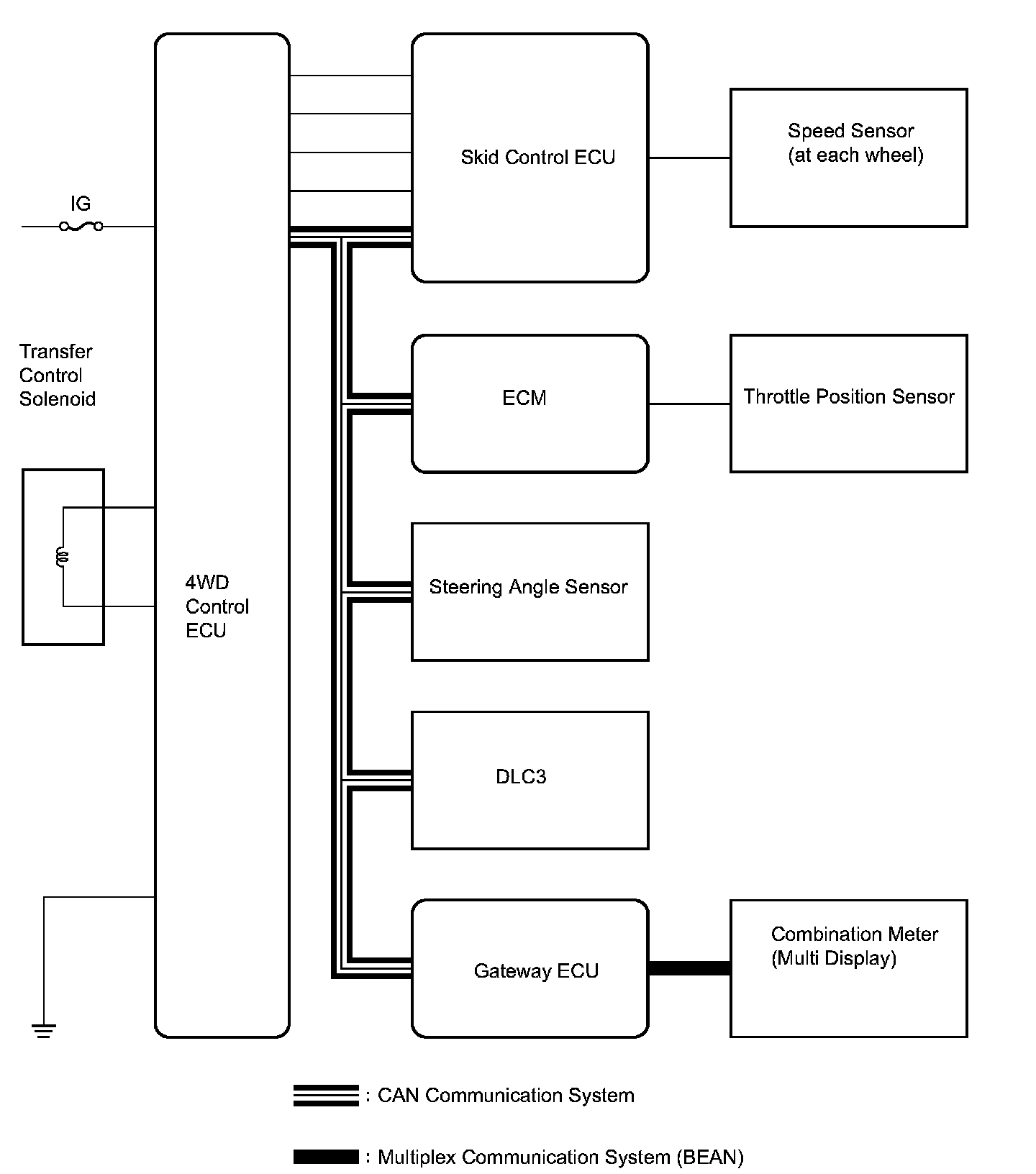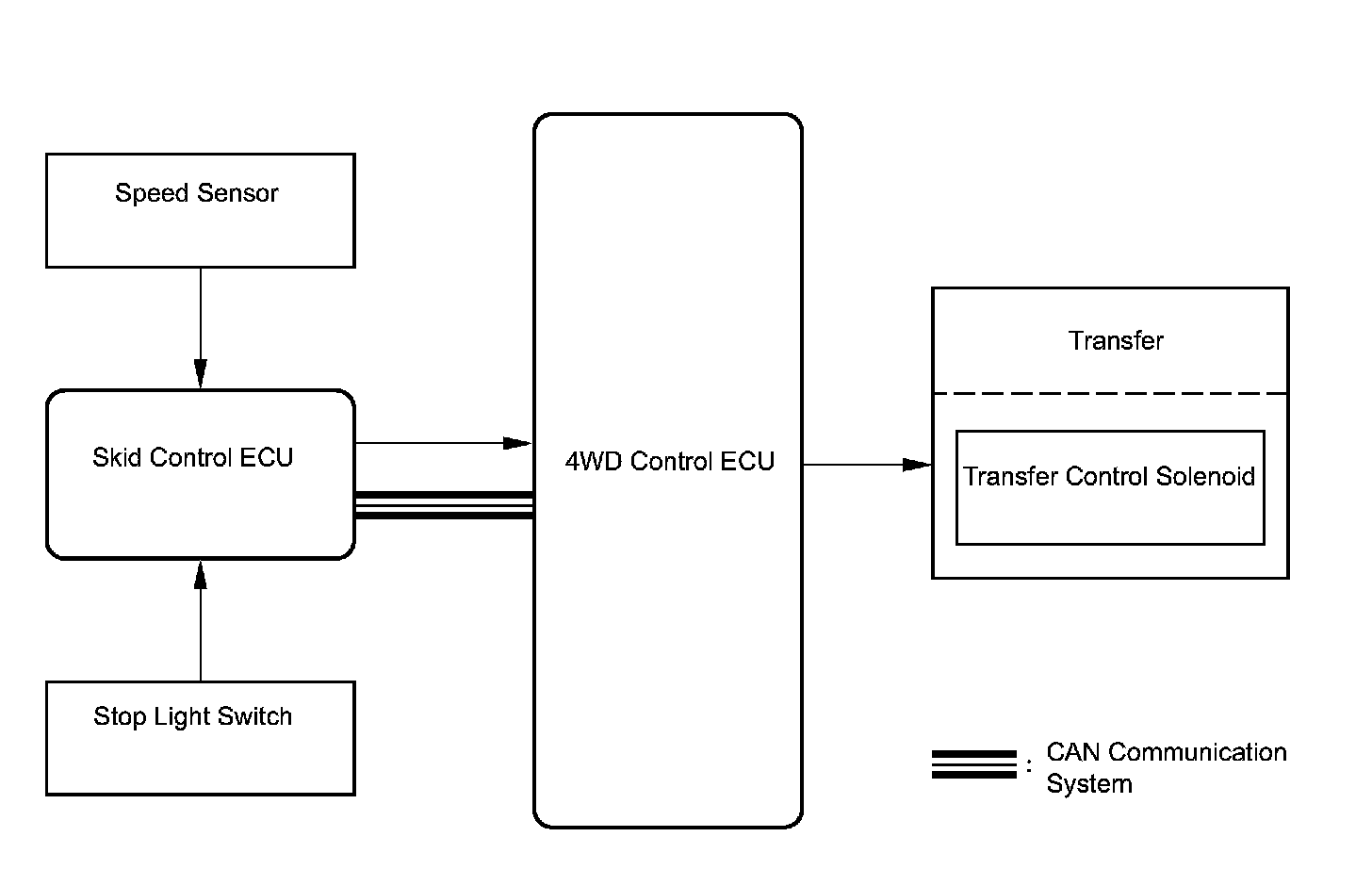 ^ The 4WD control ECU controls the transfer control solenoid based on signals from the speed sensor. The transfer control solenoid controls the fluid pressure applied to the center differential limiting clutch. Thus, slip control will be performed.