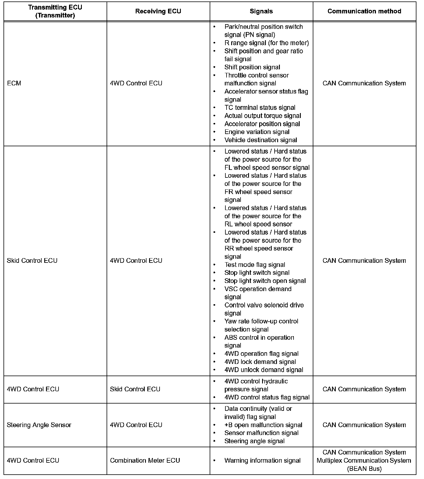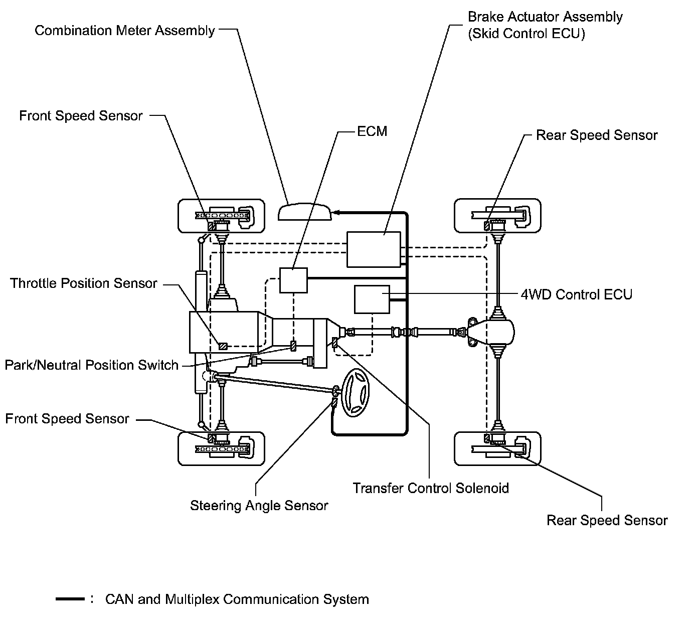 a) The Four Wheel Drive Control System (4WD Control System) consists of the hydraulic control mechanism of the transfer unit, steering angle sensor, wheel speed sensor, skid control ECU, and 4WD control ECU.