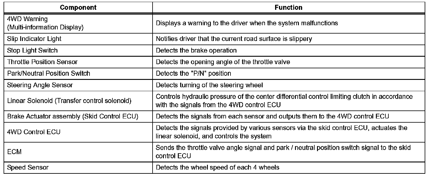 ^ The 4WD control ECU controls the center differential coupling it directly before starting the vehicle in order to prevent slipping at vehicle initial acceleration or during acceleration on a grade or a low friction road.