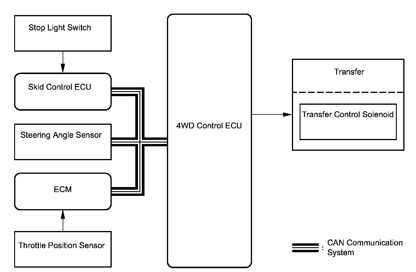 ^ The 4WD control ECU controls the transfer control solenoid based on signals from the throttle position sensor and steering angle sensor. The transfer control solenoid controls the fluid pressure applied to the center differential limiting clutch. Thus, vehicle start up and low-speed turn control will be performed.