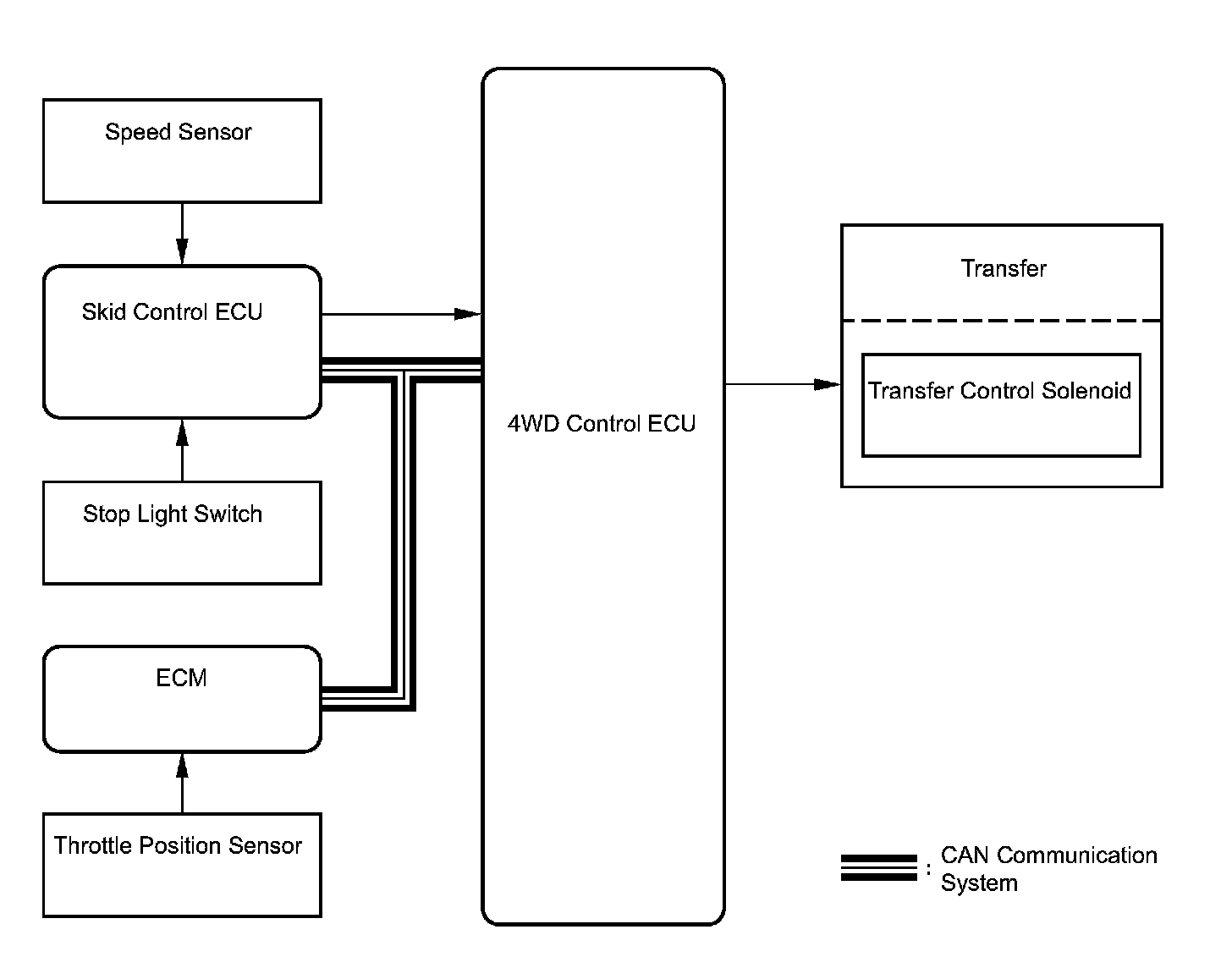 ^ The 4WD control ECU controls the transfer control solenoid based on signals from the throttle position sensor and speed sensor. The transfer control solenoid controls the fluid pressure applied to the center differential limiting clutch. Thus, slip control at vehicle initial acceleration will be performed.