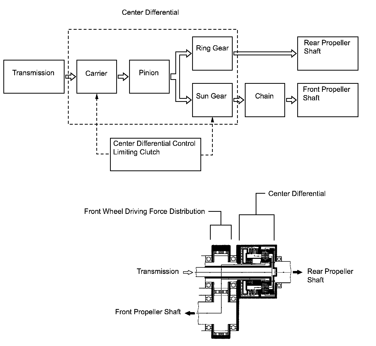 3) The center differential receives the drive force that is input by the transmission by way of the planetary carrier. The planetary carrier and the sun gear are controlled by the differential limiting clutch until they are in the lockup state.