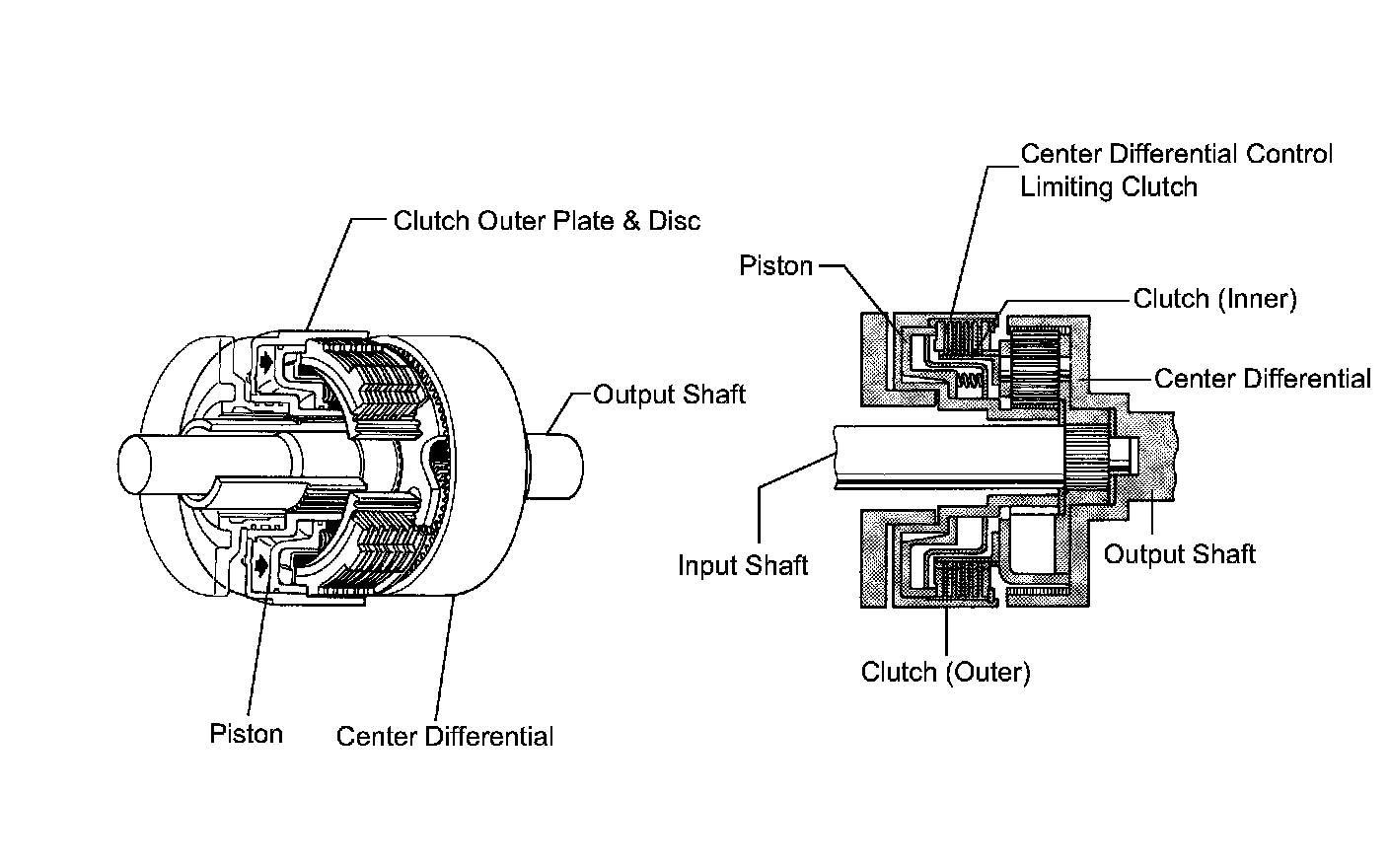 1) The center differential control limiting clutch is located between the planetary gear and the front wheel driving force distribution section. It consists of wet type clutch discs, plates, and piston. Its basic structure is the same as the clutch of an automatic transmission.