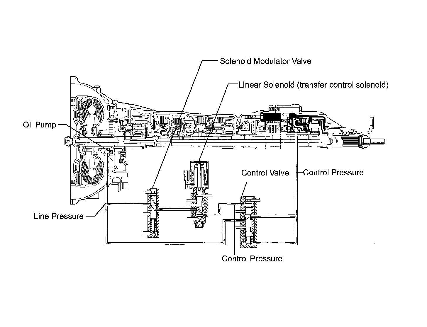 1) Line pressure for transmission control is also used by the transfer to simplify the transfer hydraulic system.