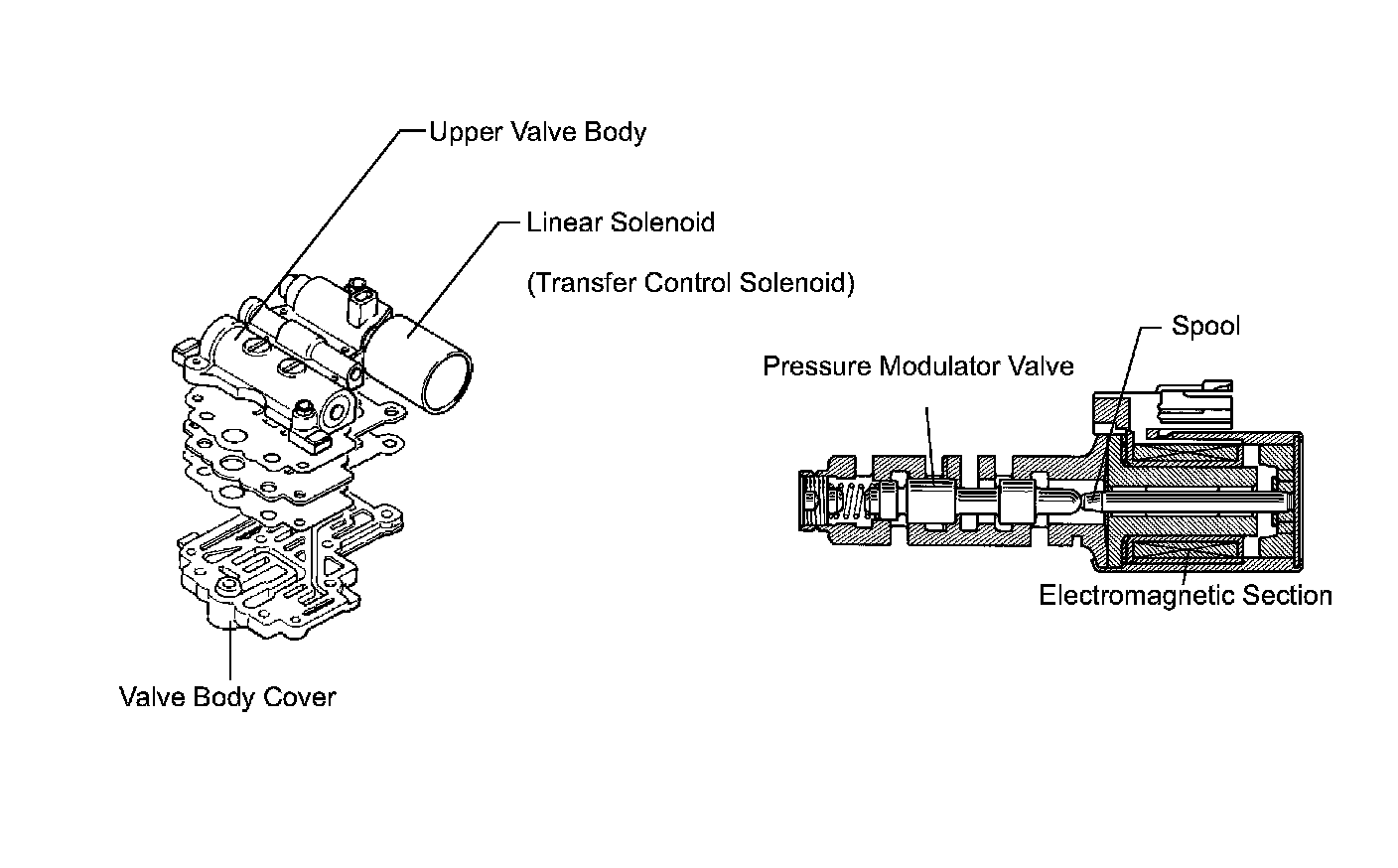 1) The valve body, which is located in the bottom of the transfer case, has a two-stage composition consisting of an upper valve body and a valve body cover. The transfer control solenoid is installed in the upper valve body.