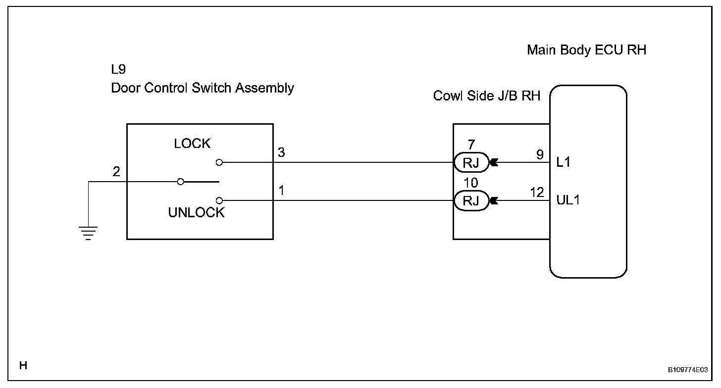 Terminals L1 and UL1 of the main body ECU RH are connected to the door control switch and door lock/ unlock request signals (by door control switch operation) are input to the ECU.