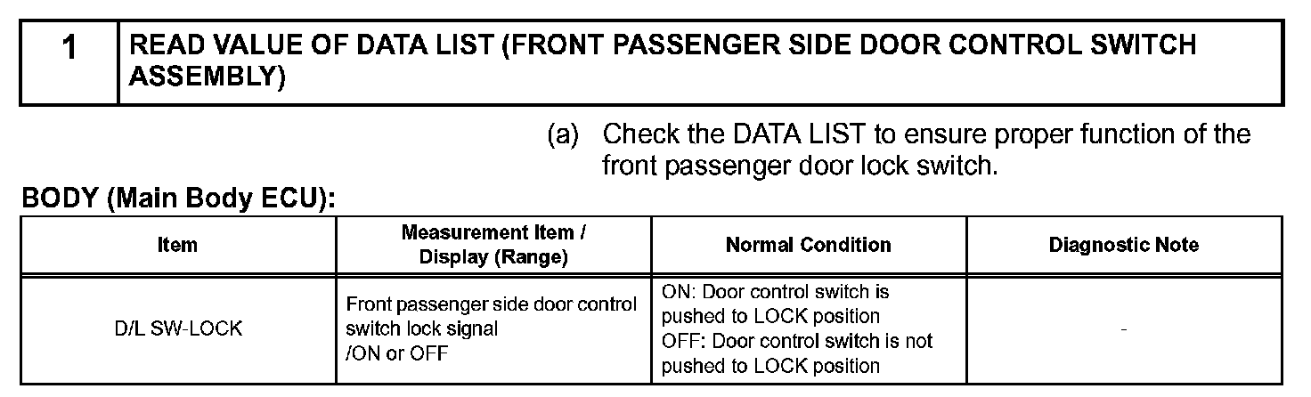 The main body ECU RH also applies constant voltage to terminal 1 of the door control switch via terminal UL1. When the door control switch is operated to unlock the doors, current flows from terminal UL1 to terminal 1. The main body ECU RH determines that this is door unlock request signal input.