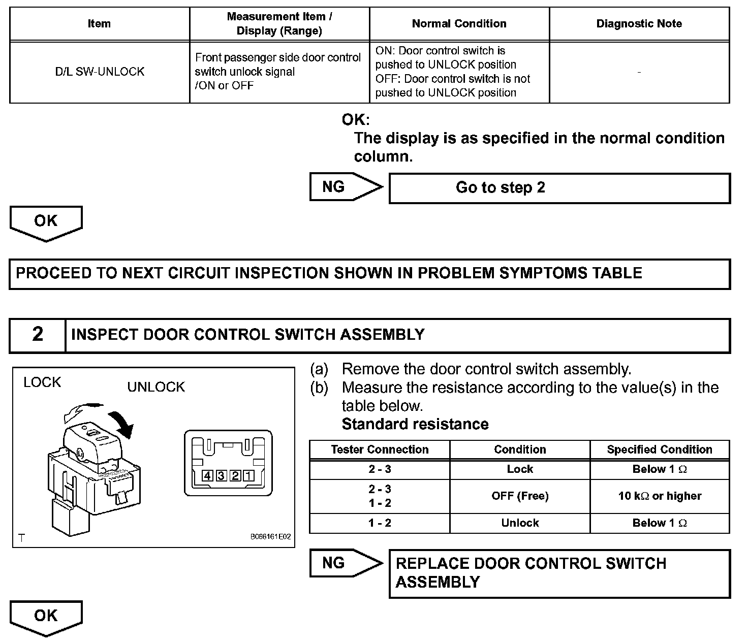 When the lock side of the door control switch is pressed, continuity is established between terminals 3 and 2 of the switch. When the unlock side of the switch is pressed, continuity is established between terminals 1 and 2.