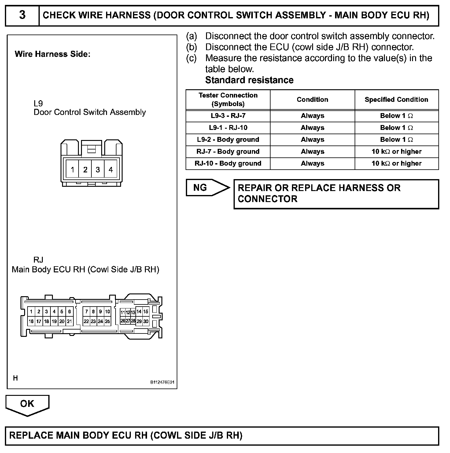 The main body ECU RH constantly applies voltage to terminal 3 of the door control switch via terminal L1.