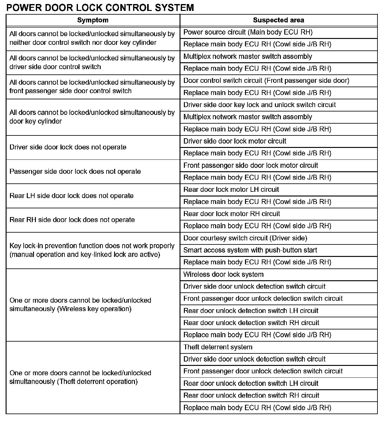 Problem Symptoms Table - Power Door Lock Control System: