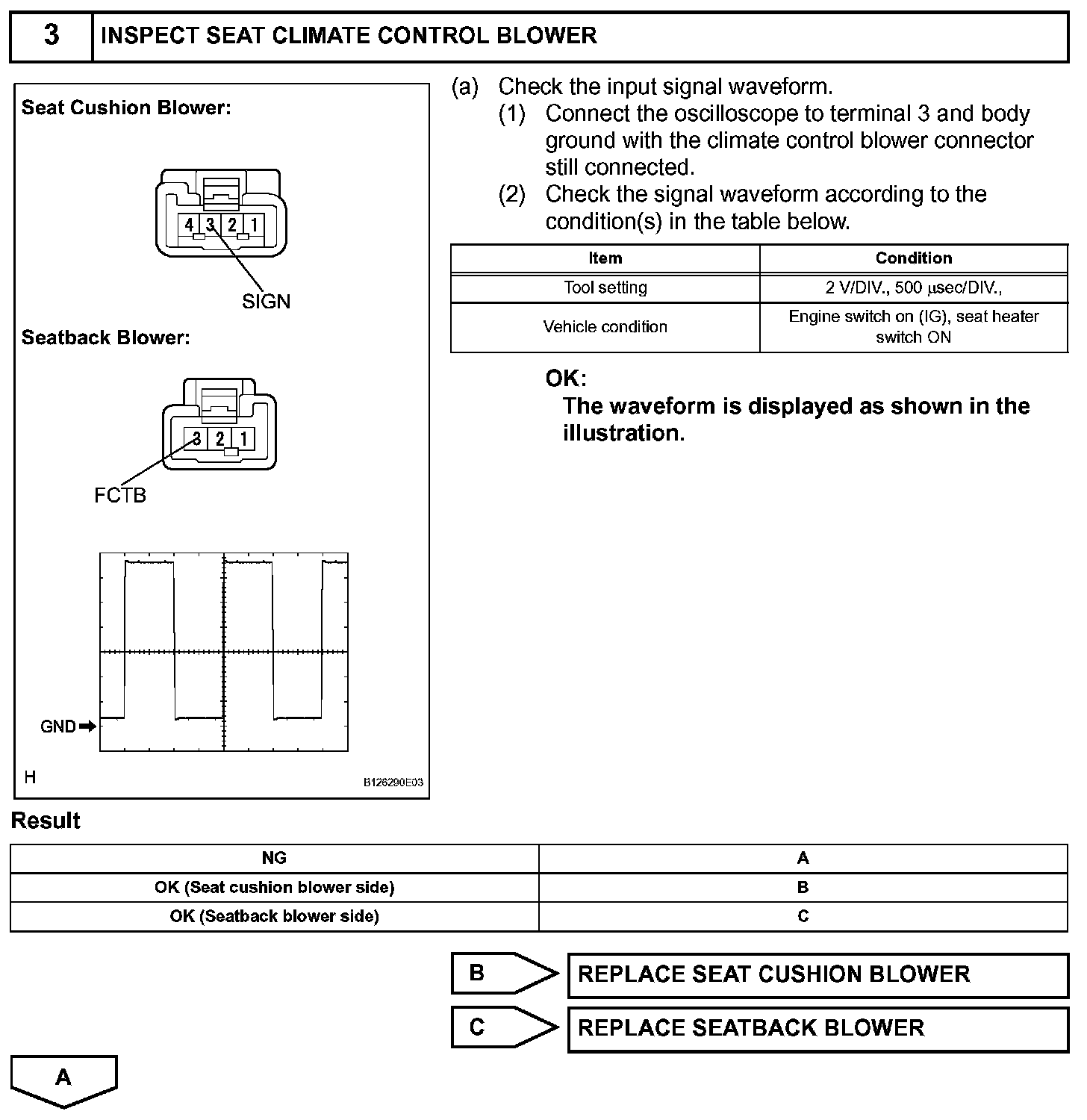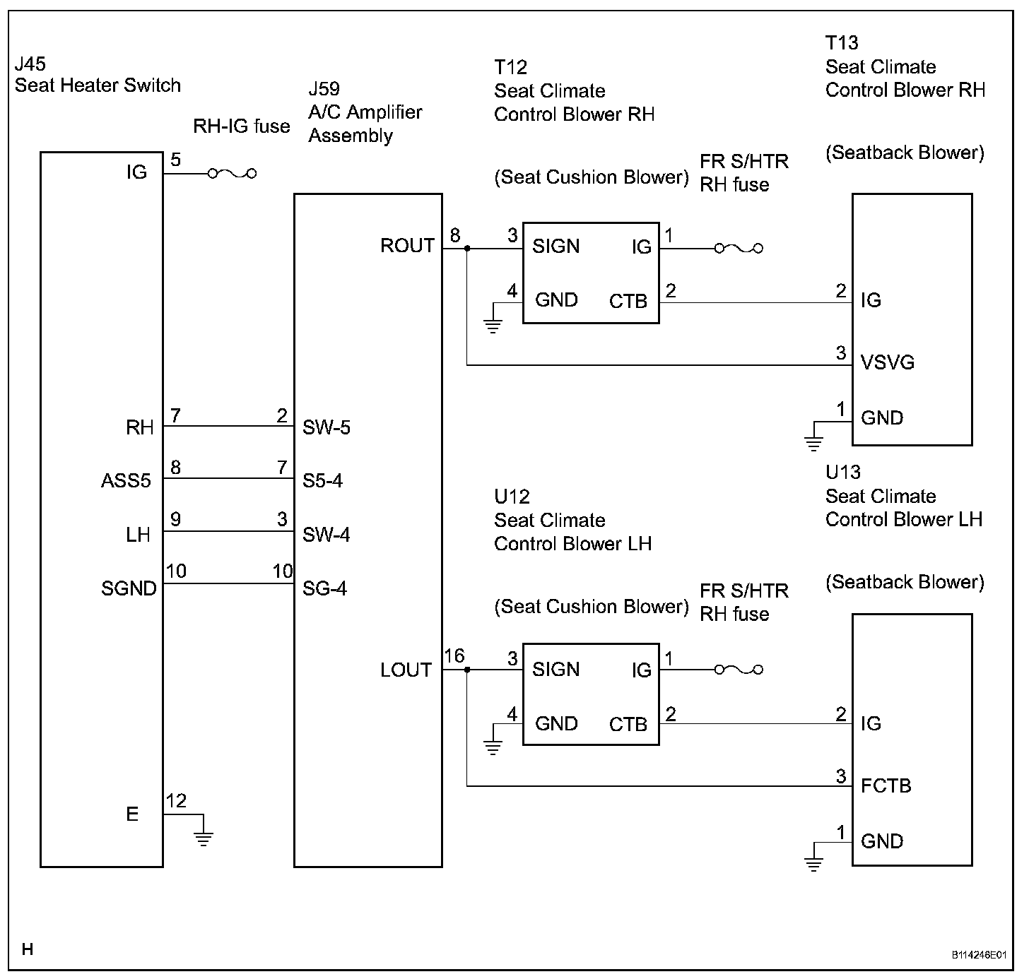 The A/C amplifier assembly receives seat position signals when the engine switch is on (IG), and then transmits airflow amount signals to each seat climate blower.