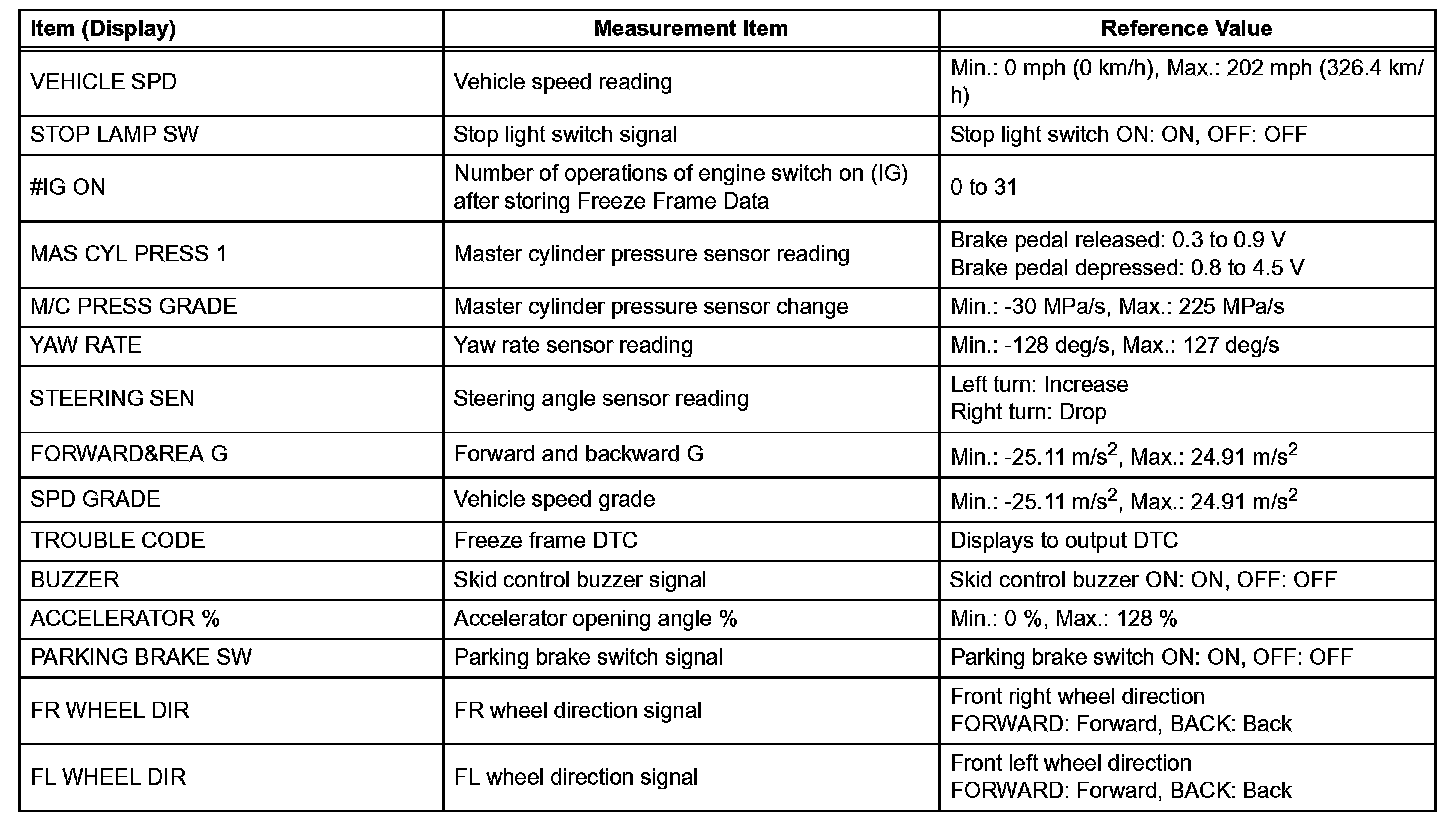 - Freeze Frame Data at the time a DTC is detected: When the skid control ECU stores data at the time a DTC is detected, no updates will be performed until the data is cleared.