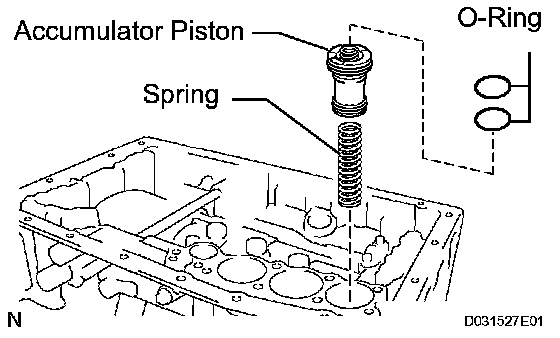 b) Install the spring and the accumulator piston to the hole.