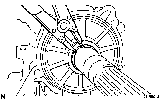 e) Using a feeler gauge, measure the clearance between the snap ring and the race.