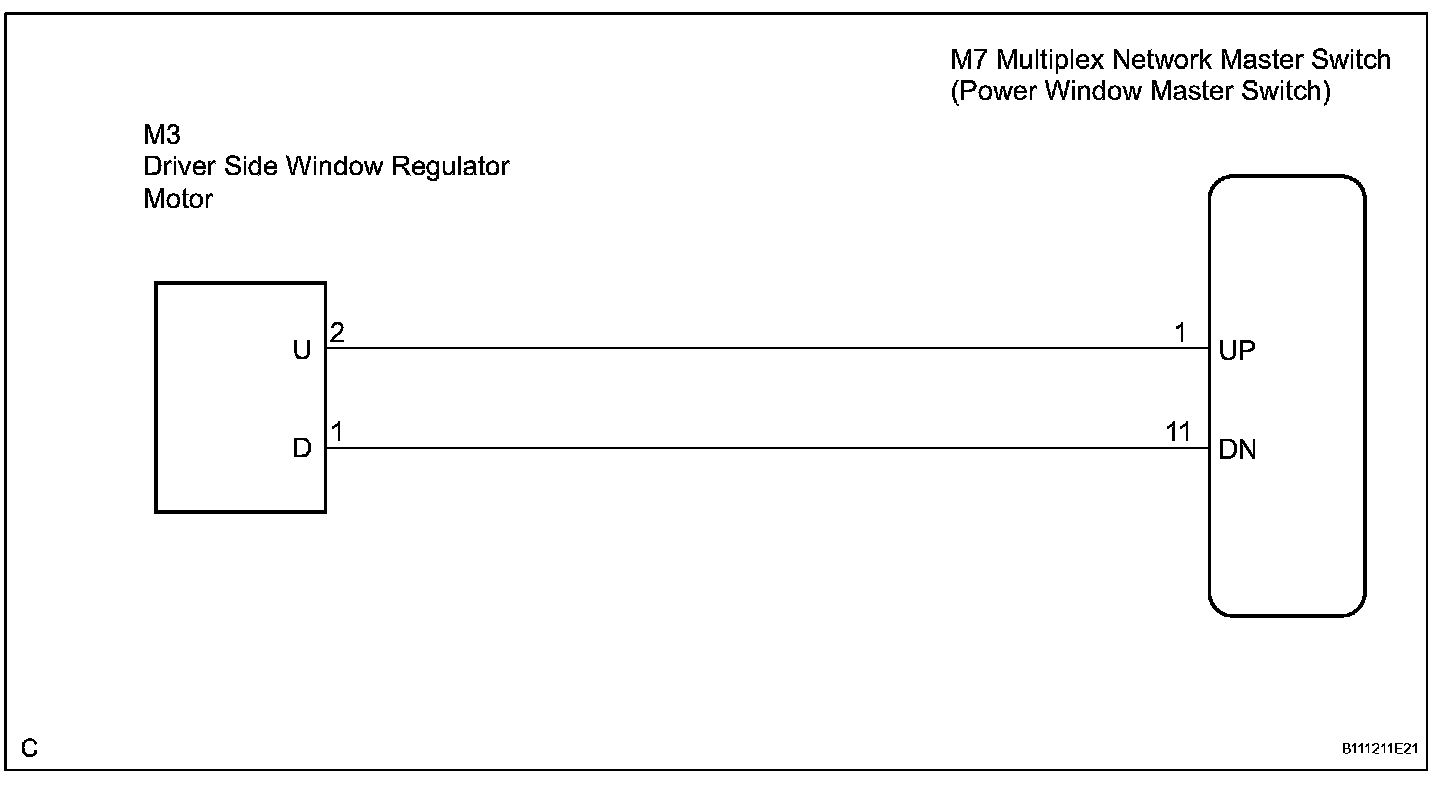 This circuit transmits signals from the multiplex network master switch to the power window regulator motor.