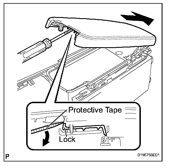 a. While pushing down on the lock using a screwdriver with its tip taped, slide the console door in the direction shown by the arrow to remove it.
