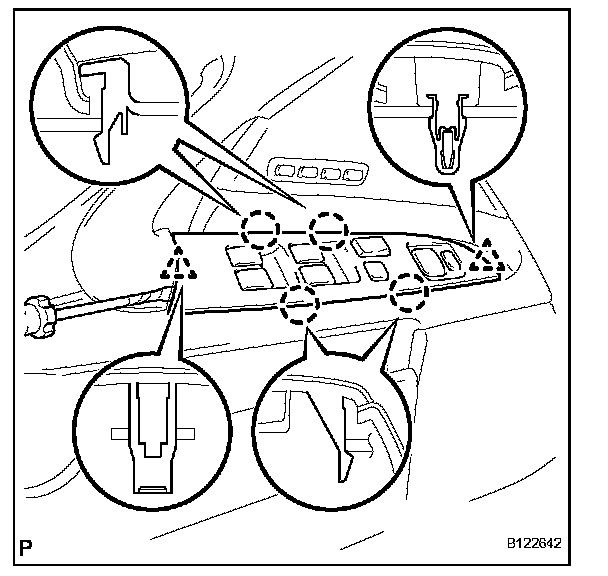 b. Engage the 2 clips and 4 claws, and install the power window regulator master switch assembly.